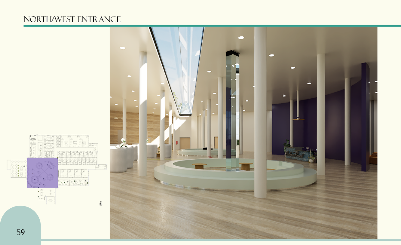 The goal of this project was to create a high-end, eclectic, and intimate boutique hotel that highlights the importance of community through an existing building in Stevens Point, WI. Futuristic and elegant spaces based off the movie, The Fifth Element will provide people with an atmosphere to socialize and create memorable experiences. The universal design provides a unique comfort for all. A modern and sustainable design enhances a clean, healthy, and biophilic environment that connects humans to nature.